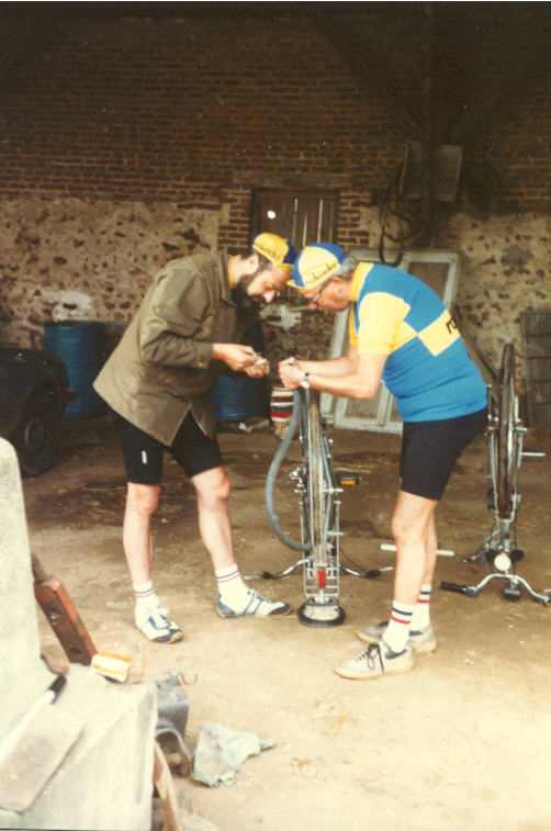 Gegen 10.00 Uhr treffen wir bei Huberts Freund Robert Laquerriere ein. Klaus und Hartmut flicken ihre Räder. Hubert nimmt sich das Ersatzfahrrad vom Pkw und Zeit für einen Kaffeeplausch mit der Familie.